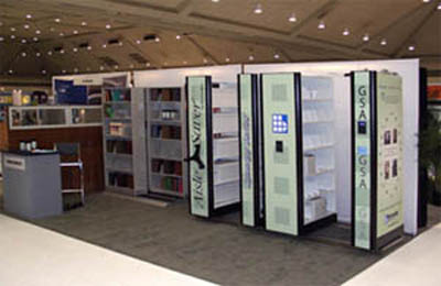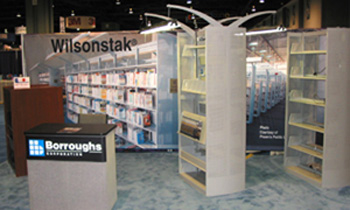 Wilsonstak® Life-sized photo graphic printed on 20 ft poly-fabric backdrop-produced to give the illusion of product being in a library environment. ALA Tradeshow |