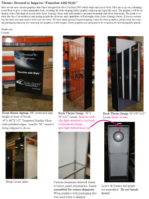 Borroughs Aisle-Saver tradeshow display "Dressed to Impress". Custom point-of-purchase display. Starfire glass reverse printed panel with polished edges and a custom designed reverse printed 3D backlit box.